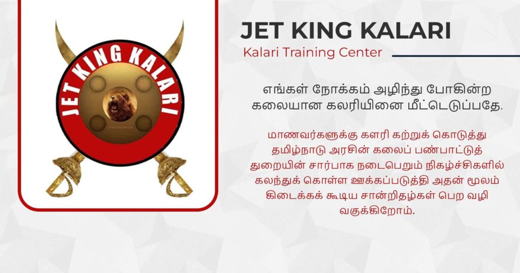 Jetking Kalari ஜெட்கிங் மர்ம திருமுக் களரிக் சங்கம் 5/5 Whatsapp Facebook Youtube Contact Us +91 9487875619+91 9360773922jmtks.111@gmail.com Whatsapp Call Mail Map களரிப் பயிற்சியின் நோக்கம் எங்கள் நோக்கம் அழிந்து போகின்ற கலையான கலரியினை மீட்டெடுப்பதே. களரிப் பயிற்சியின் முறைகள் வணக்க சுவடு நிலைச்சுவடு (ஒற்றைச்சுவடு) – 12 முறை பிரிவுச்சுவடு (நடசாரி சுவடு) – 12 முறை கைப்போர் (ஜோடி முறை) – 12 முறை கம்புச்சண்டை (ஜோடி …